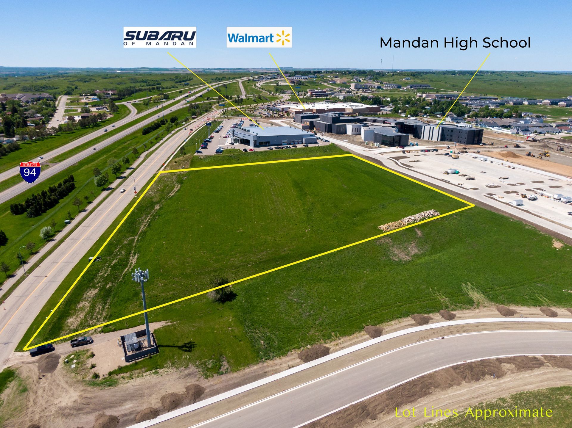Commercial land with great visibility and 561 feet of frontage along Old Red Trail. This land consists of 3 lots totaling 5.53 acres being sold together. The new Mandan High School building and land are adjacent to the North of this property. South facing exposure. Any future building and signage should have good visibility from Interstate 94. Zoning is CC Commercial with Restrictions (no self-storage or Multi-use shops). Power is on-site and water and sewer are available. Buyer to verify available utilities, easements, pending specials, taxes, Mandan City Development Agreement and zoning.