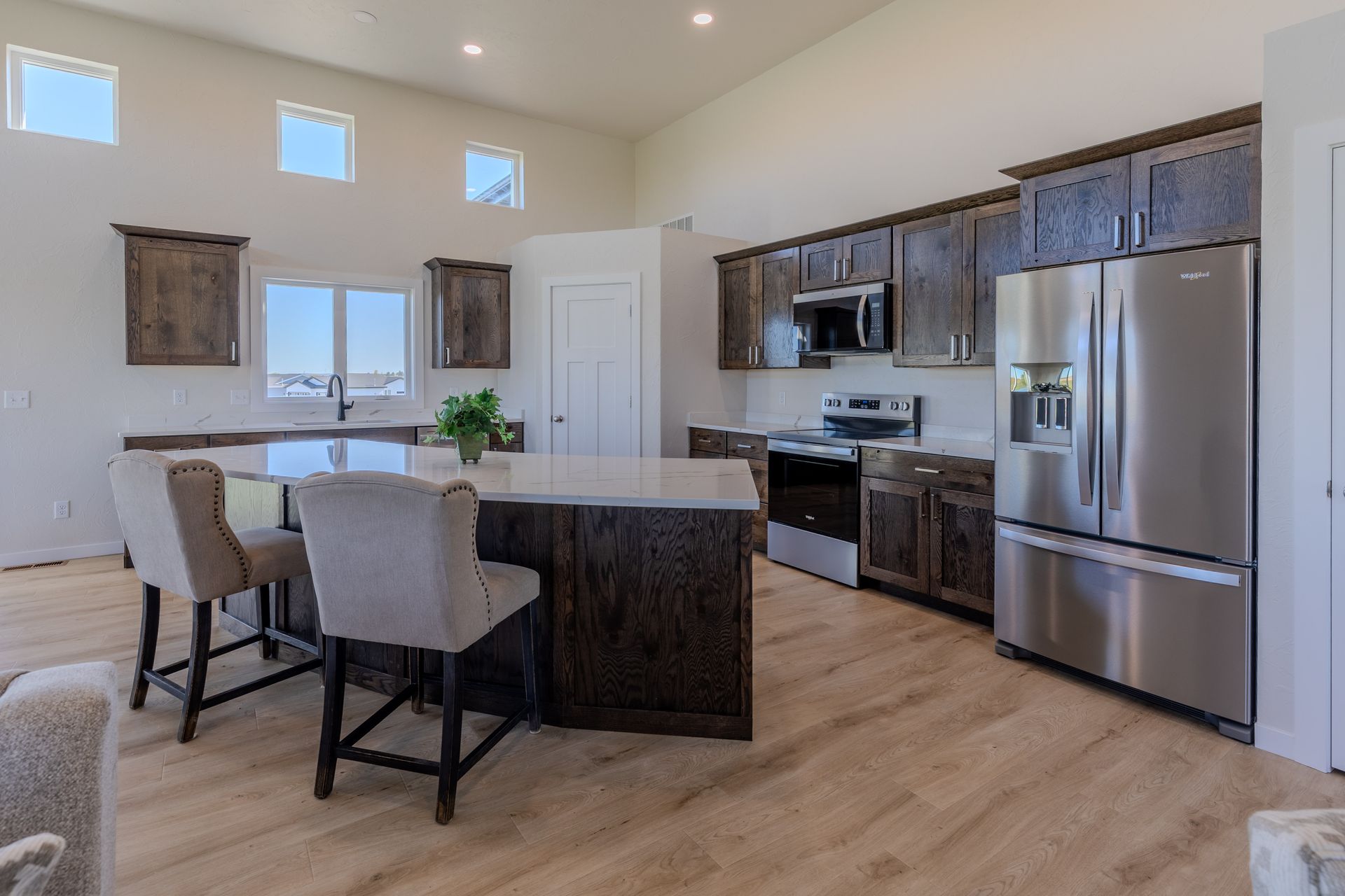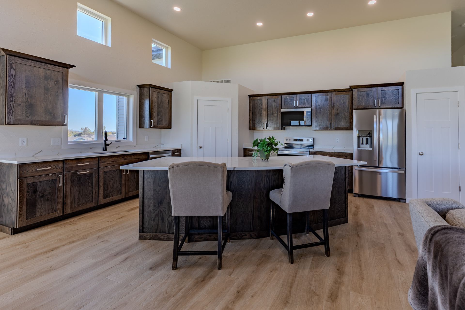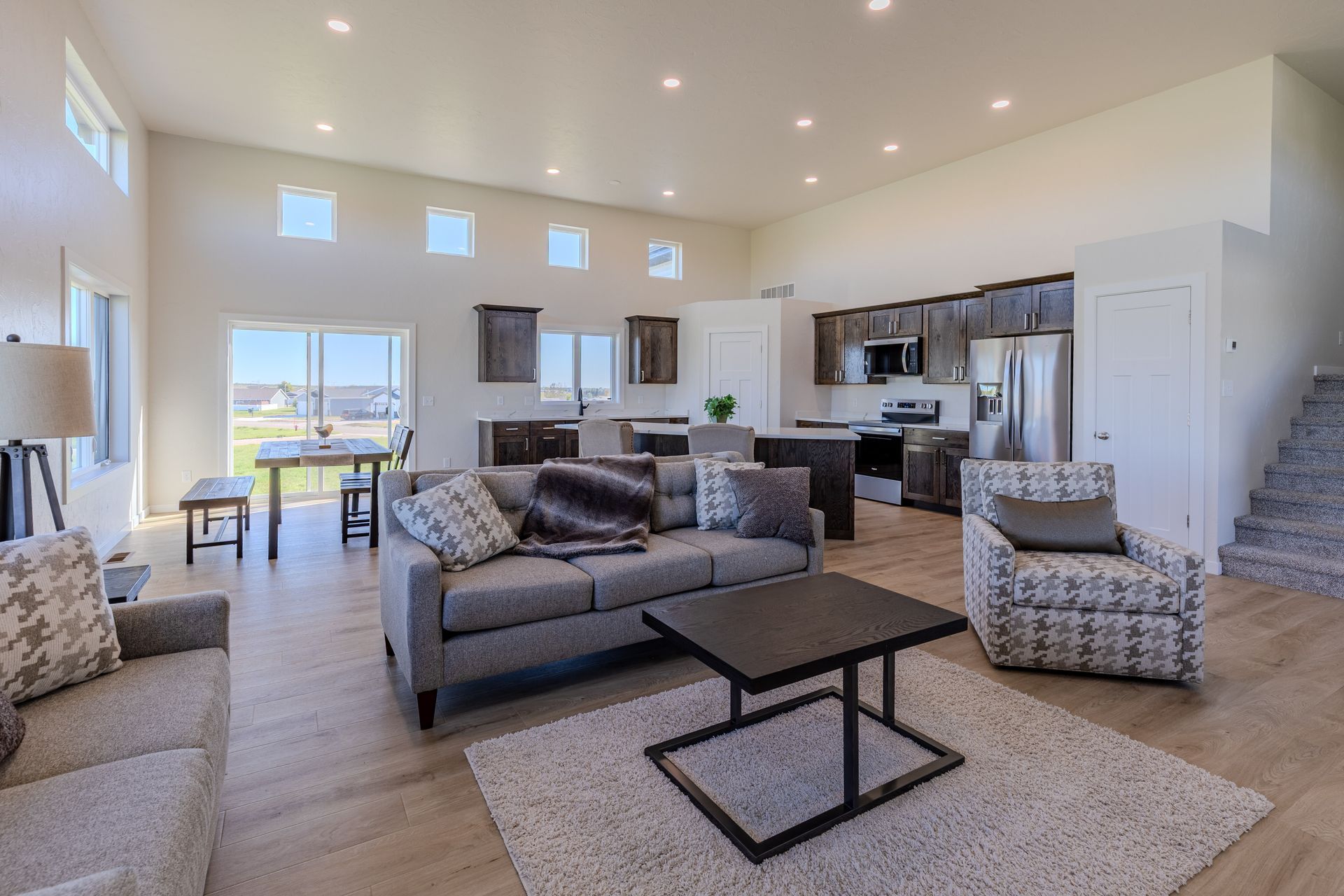 Welcome to this fully finished, newly built home in the Sattler's Sunrise Addition that is close to Sunrise Elementary School, shopping, dining, recreation trails, and more. This 4 bedroom, 3 bathroom home offers comfort, style, and functionality. The open-concept main level features soaring 12-foot ceilings, a living room, and a spacious kitchen with quartz countertops, soft-close drawers, a large center island, and two pantries. The adjacent dining area overlooks the backyard. Upstairs, the primary suite includes dual sinks, shower, and a walk-in closet with built-in shelving. You'll also find two additional bedrooms, a full bath, a laundry room with cabinets, and a storage room. The finished lower level boasts daylight windows, a large family room, a 4th bedroom, and another full bath. Extra storage is tucked beneath the oversized front entryway. The insulated 3-stall garage features a floor drain and water hookup. Note: Taxes and specials are not yet finalized—buyer to verify including all other property information.